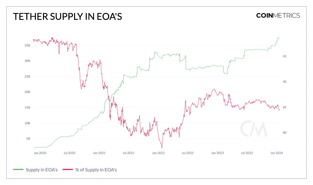 尽管Tether在智能合约中的使用已经扩大,但它主要由外部拥有的账户(EOA)或由私钥控制的账户持有,类似于个人用户拥有的账户。在以太坊上,Tether(ETH)的供应已经上升到370亿美元,占以太坊总供应的84%。这些趋势反映了数字美元的不断增长,不仅作为价值存储或对冲波动的工具,还作为交易活动的工具,例如交易或支付。