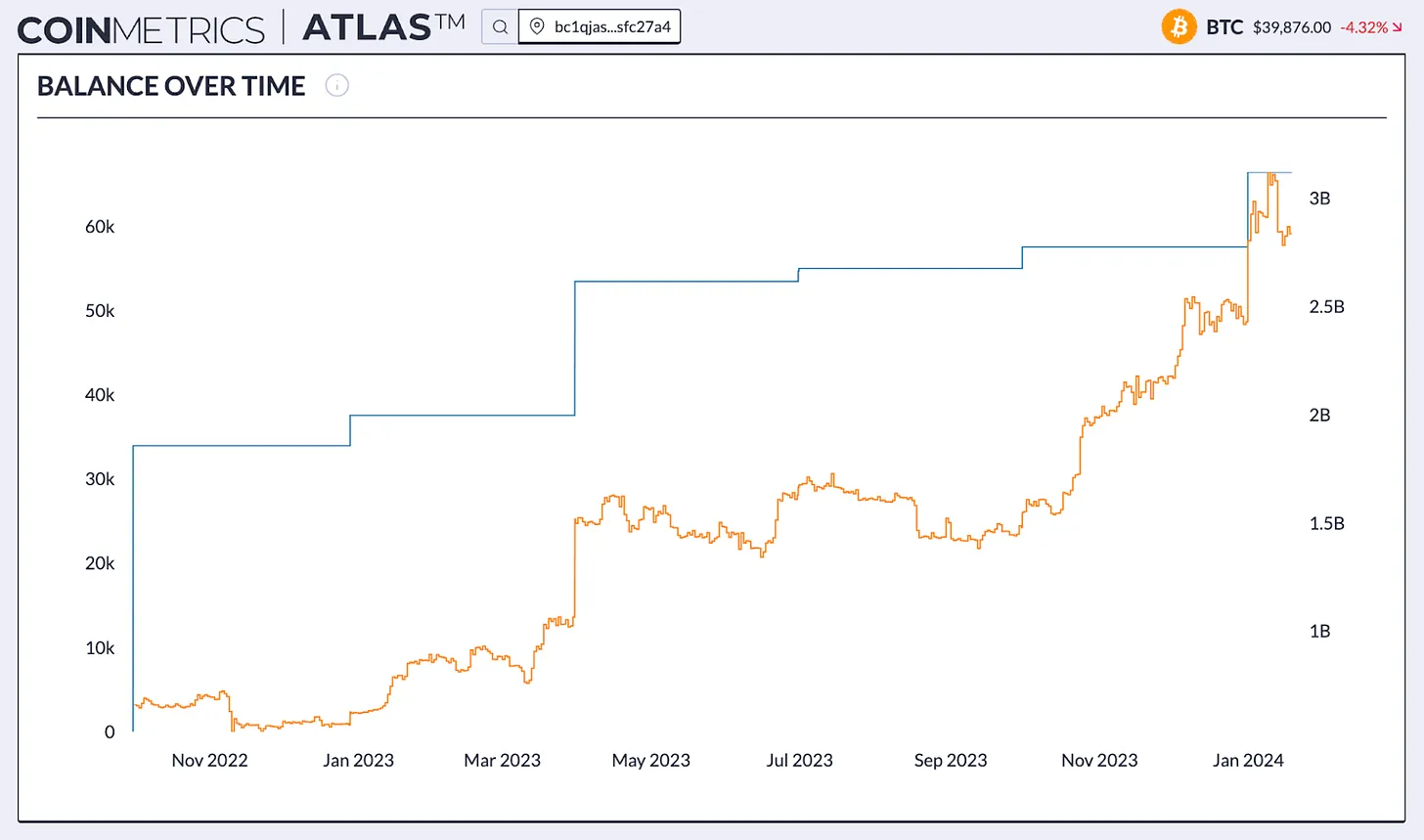 多年来,Tether的储备组成发生了几次变化。虽然像商业票据这样的债务形式在2021年占据了储备的大部分,但他们最新的认证表明,储备主要由美国国债组成,反映了不断上升的利率环境。在2023年5月,Tether宣布他们将从实现的利润中分配高达15%的资金用于购买比特币,以增加USDT的超额储备。这已经实现为57.5K BTC,相当于价值 16亿美元的比特币持有量,与他们在 2023 年第三季度的最新证明一致。然而,如果可以确定将这个比特币账户与Tether明确关联,那么这意味着Tether最近购买了另外8.9K BTC,使其目前总数达到66.4K BTC。这一推断得到了加强的证据,因为向这个账户的信用似乎与与Tether密切相关的交易所Bitfinex相关联。