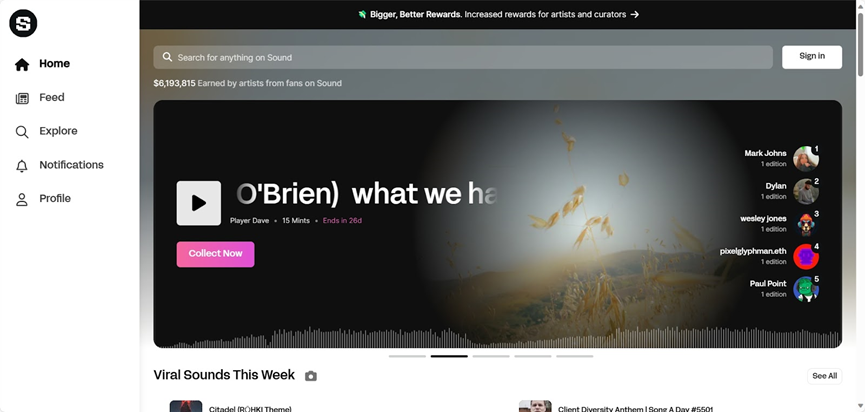 Sound.XYZ 是一个以太坊链上的 NFT 音乐探索和流媒体平台,它提供了一个方便的钱包功能与 NFT 交易途径。