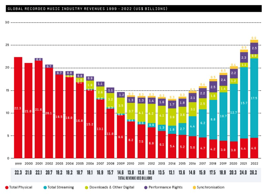 根据 IFPI 的 2023 全球音乐产业报告,2023 年全球音乐市场规模已达到 262 亿美元,较 2022 年增长了 9%,世界上每个地区音乐产业的收入均有增加,录制音乐市场同比增长 9%,付费订阅用户群体达到了惊人的 5.89 亿人。当前,音乐产业正经历着快速变化。一方面,独立音乐的兴起打破了传统唱片公司的市场垄断;另一方面,全球化和互联网的普及使得音乐跨越地域界限,触及全球听众。