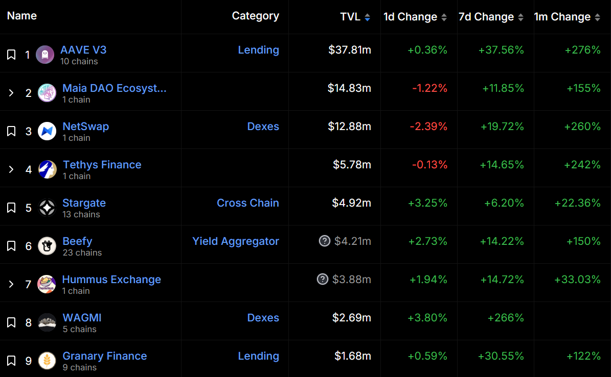 这一系列举措最直接的受益者无疑是 Metis 生态上的 DAPP,实际上这些 DAPP 的表现也没有让人失望,主要的生态项目在过去一个月里 TVL 增长基本都超过了 100% 。