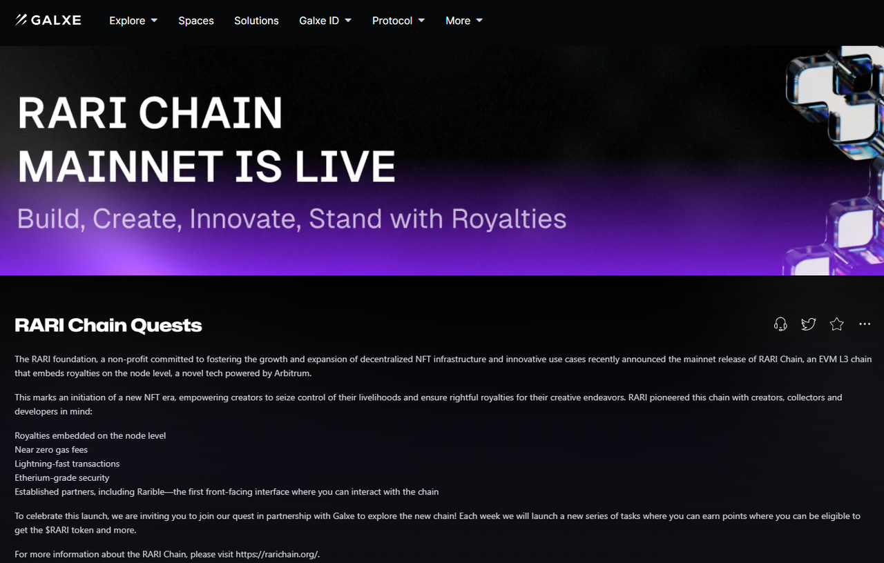 另外,GALXE也在其官网上推出了与Rari Chain相关的任务,以庆祝Rari Chain的发布。这些任务允许参与者赚取积分,并有机会获得$RARI代币等奖励。这一举措展示了加密货币社区对Rari Chain的兴趣和积极参与,也为更多人提供了参与加密货币生态系统的机会。