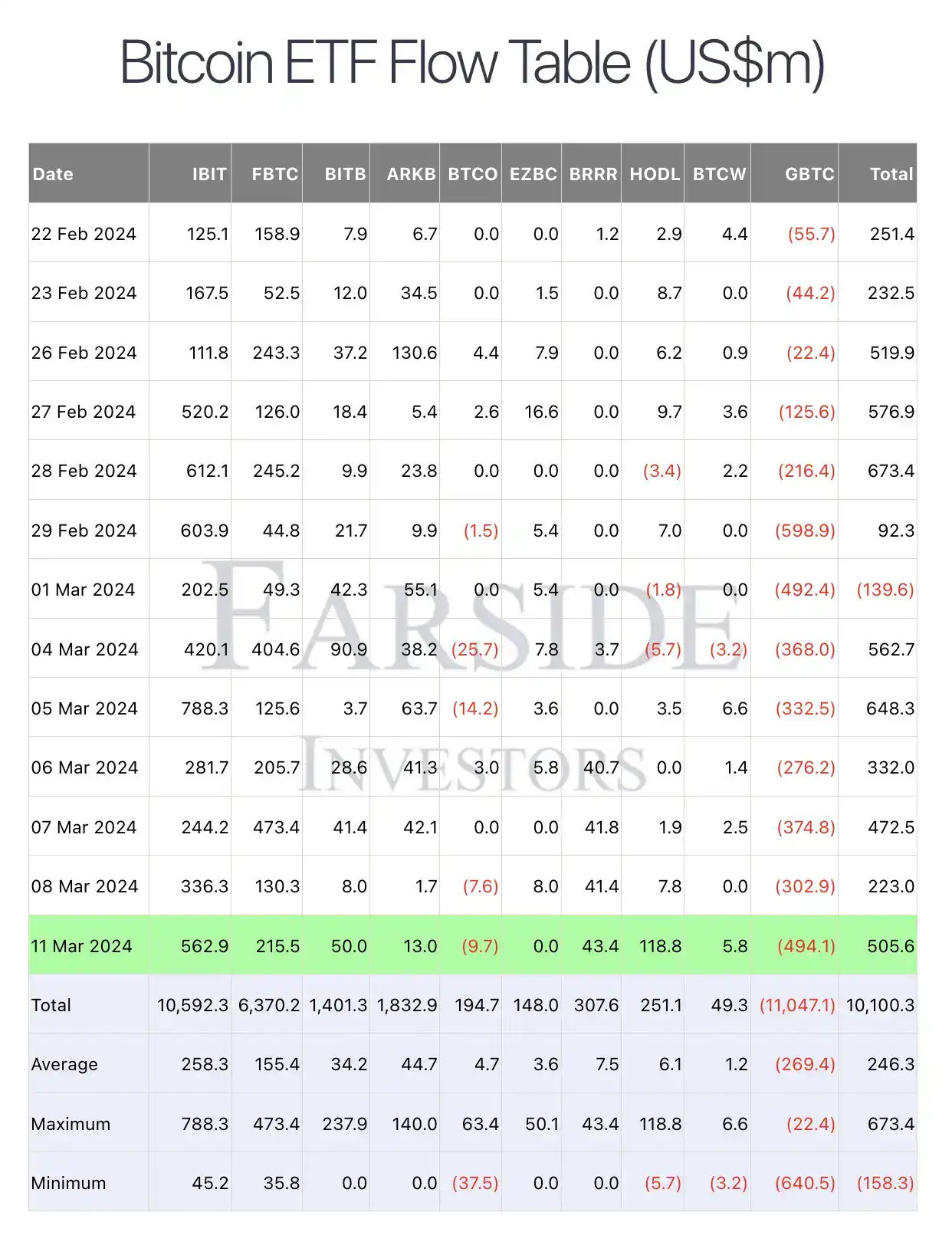 据 Farside Investors 数据,比特币现货 ETF 自推出以来累计净流入 101.003 亿美元。其中: IBIT 累计净流入 105.923 亿美元; FBTC 累计净流入 63.702 亿美元; BITB 累计净流入 14.013 亿美元; ARKB 累计净流入 18.329 亿美元; GBTC 累计净流出 110.471 亿美元。