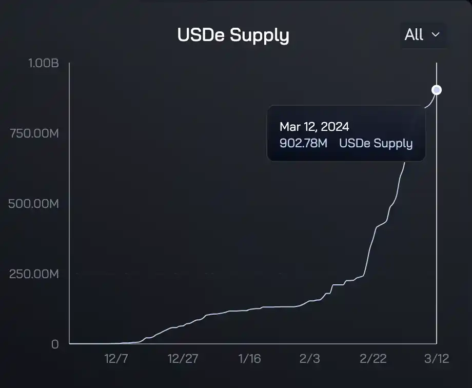 由 Ethena Labs 发行的稳定币 USDe 市值突破 9 亿美元,现为 9.0278 亿美元。