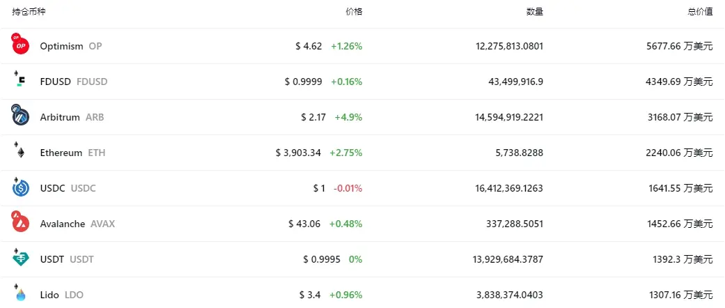 据 Rootdata 统计的 34 个 Wintermute 链上地址,截止发文前,Wintermute 链上总余额约 3.52 亿美元,最大仓位是 OP 代币,约 1273 万枚(价值约 6000 万美元)。