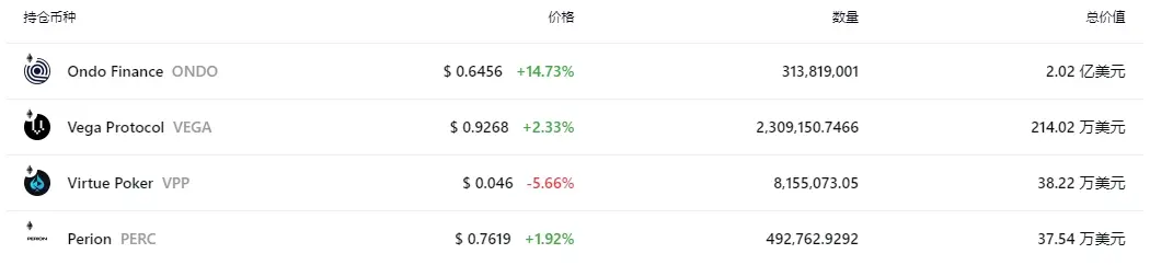 Pantera Capital 领投了 Ondo Finance 的种子轮及 A 轮融资,截止发文前,拥有 3.13 亿枚 ONDO(价值约 1.57 亿美元),占总流通量 3.13% 份额,但目前处于流通状态的只有 1.39 亿枚,剩余部分还需解锁释放。