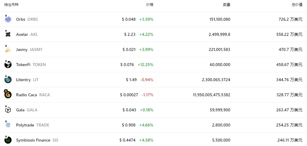 据 Rootdata 统计的 12 个 DWF Labs 链上地址,截止发文前,其链上持有近 5500 万美元资产,分布在 130 多个币种,最大仓位是 1.51 亿枚 ORBS,价值约 689 万美元。