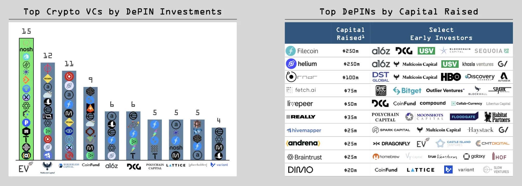 DePIN生态系统快速扩张,投资者的兴趣也愈发浓厚,他们对 DePIN 进行了多次押注,DePIN排名前 10 的项目总计约募集到了 10 亿美元。随着该领域的成熟,我们预计其中一些项目将开始得到广泛采用。