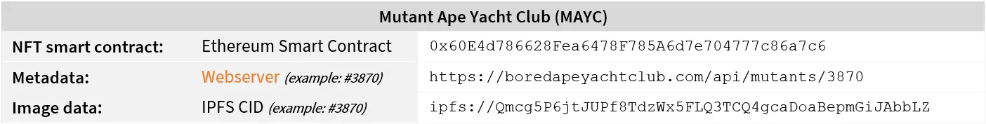 相比之下,MAYC 将 NFT 元数据存储在中心化服务器上,图像存储在 IPFS 上,这使得元数据容易发生更改,并影响集合中 NFT 的真实性。
