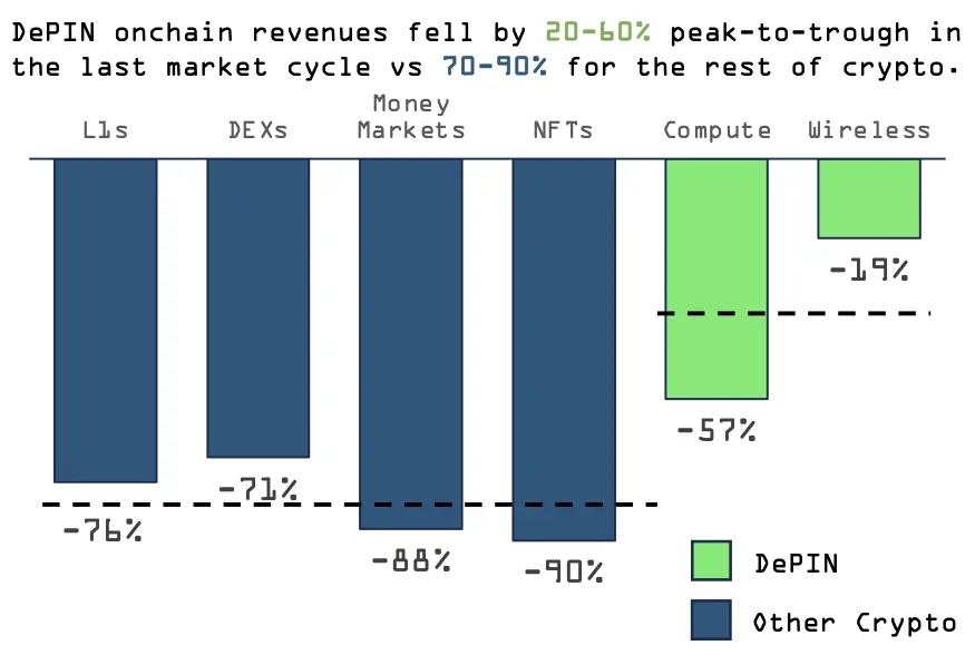 本次研究探索了DePINs赛道,在整个加密市场波动的背景下,DePINs表现出了稳定而持久的发展表现。值得一提的是,DePINs的收入模式被证明是基于实用性而非投机性的。虽然整体加密市场在过去几年经历了70-90%的急剧下滑,DePINs的收入仅从最高点下降了20-60%。