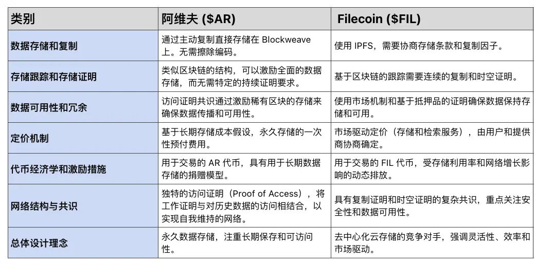 Filecoin ($FIL)、Crust ($CRU)、Sia ($SC)、Storj ($STORJ) 和 Swarm ($BZZ) 代表了一系列去中心化存储项目,尽管此列表并不详尽。随着 Filecoin 成为该领域的重要竞争对手,Greythorn的研究团队整理了一个综合表格来比较 Arweave 和 Filecoin,突出它们的差异和特点。
