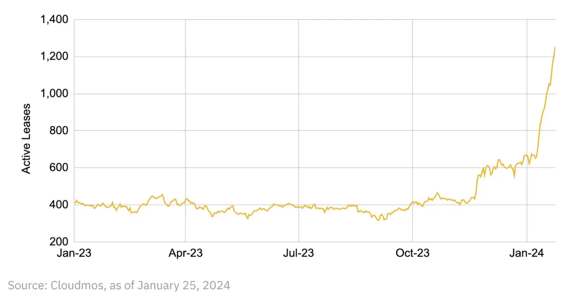 截至 2024 年初,Akash 拥有大量资源,并且活动激增,特别是由于人工智能的发展和对高性能 GPU 的需求增加。自 2023 年初以来,活跃租赁量增加了两倍多。