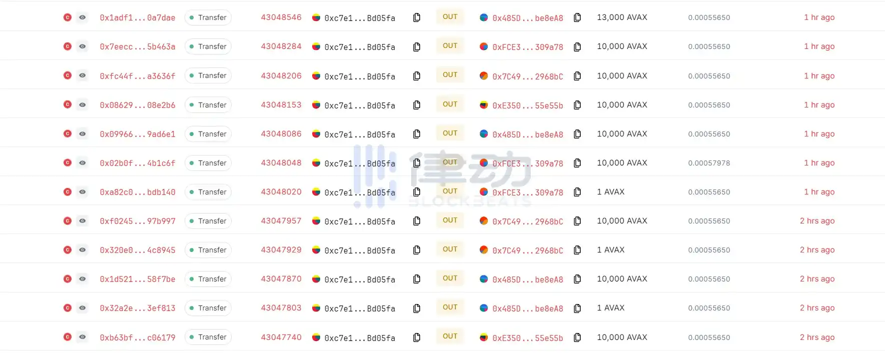 据链上数据,雪崩生态募资项目 Sener 的资金收集地址发生大额异动,目前该地址内的 AVAX 已不足 28 枚。 该资金地址于数小时前向多个地址分批转账大额 AVAX 代币,粗略计算已达 93,000 枚,约合 570 万美元。