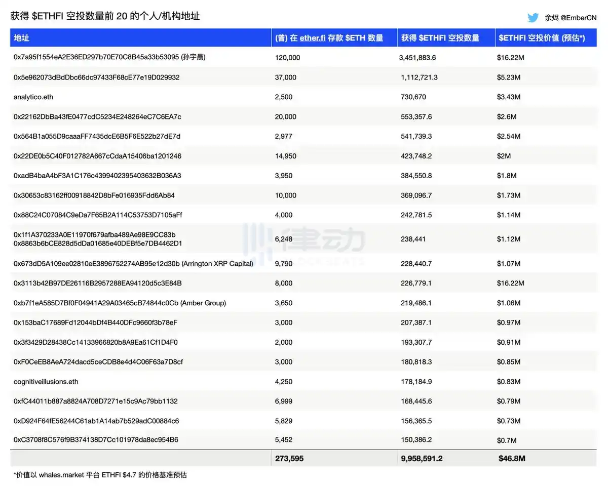 根据其统计,前 20 个地址为 ether.fi 贡献了三分之一的 TVL(27.3 万枚 ETH)而获得了 996 万枚的 ETHFI 空投。这是本次空投总量的 15%,以 Whales Market 上 4.7 美元的价格计算,价值 4680 万美元。