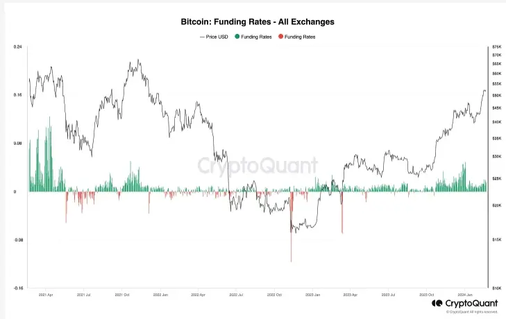 所有 CEX 的比特币资金费率都达到了历史最高水平,这令人担忧。我们有着正的资金费率,这是看涨的,因为交易者押注市场将会上涨。只要市场不大幅下跌,且多头不被清算。
