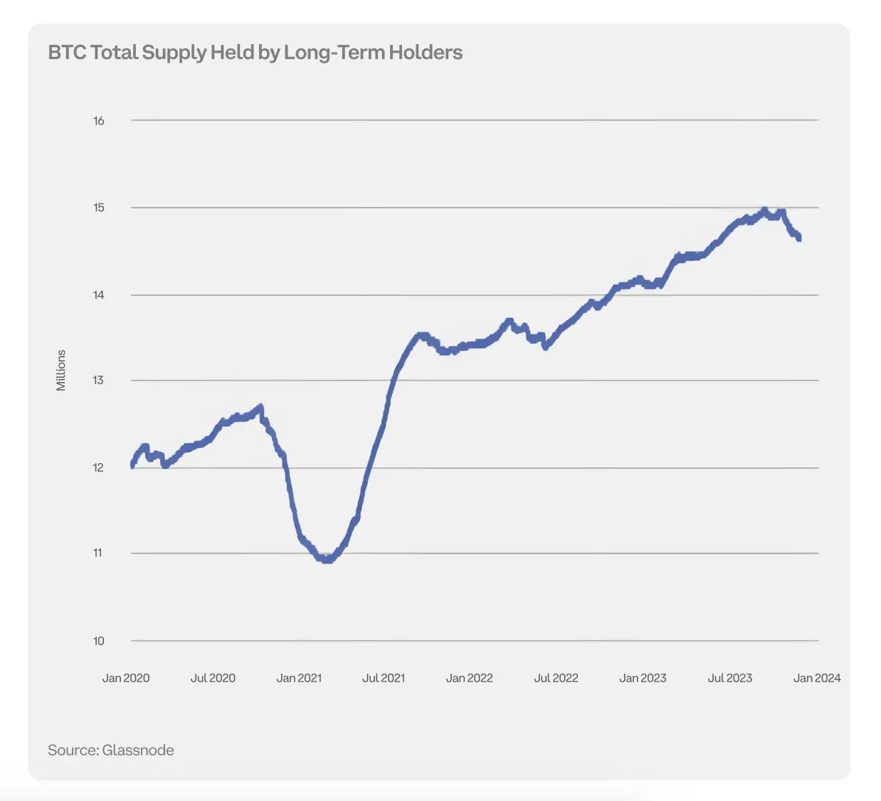 按照历史标准,长期持有者手中的供应量相当高,尽管自1月中旬推出现货比特币ETF以来,供应量已开始下降。