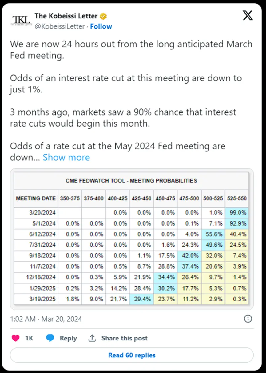 本月降息的可能性已暴跌至仅 1%,与去年年底市场预期的 3 月份降息 90% 的可能性相比大幅下降。