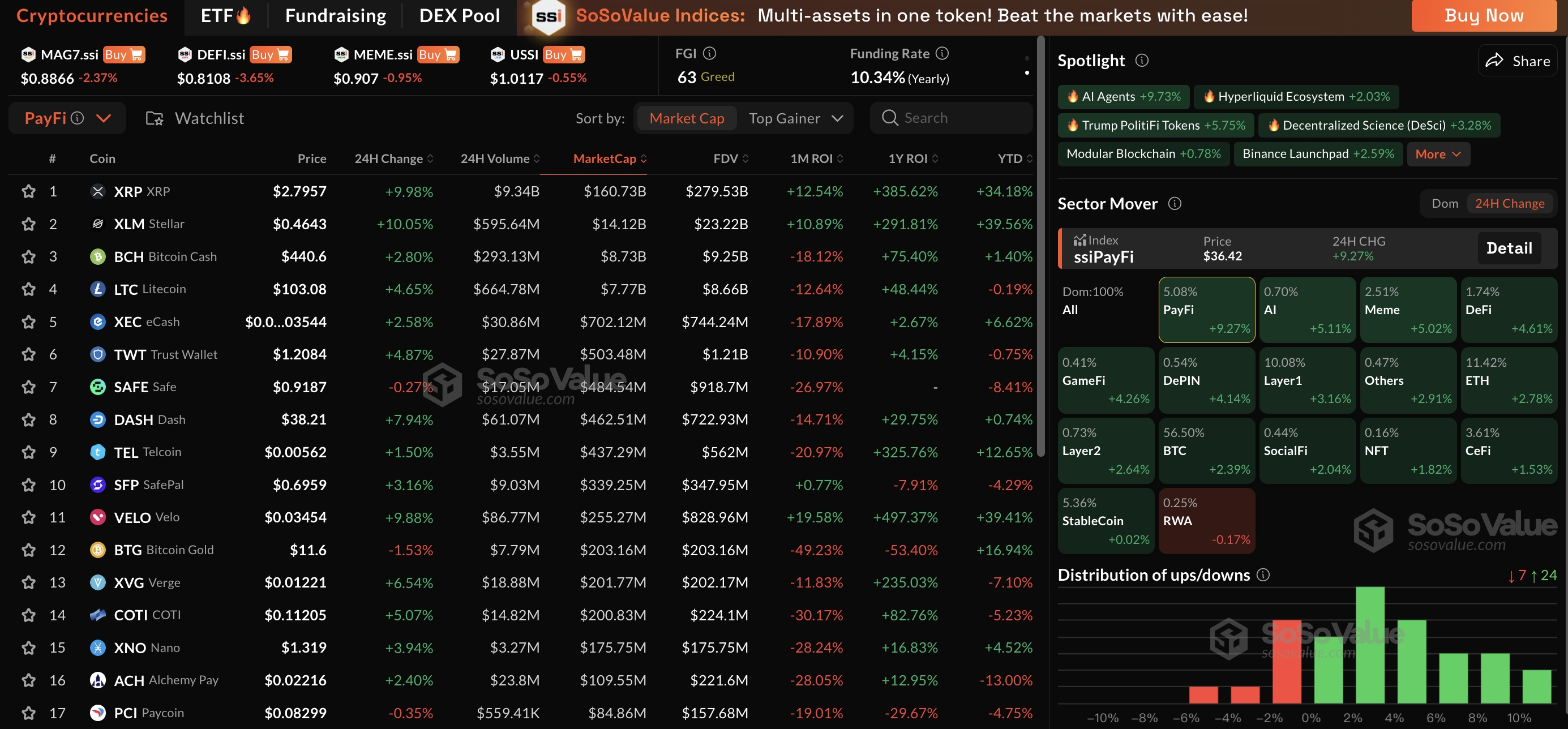 萌币网 消息,据 SoSoValue 数据,加密市场板块迎来普涨,AI Agents、PayFi 板块 24H 涨幅达 9.73%、9.27%。其中 AI Agents 板块内,Virtuals Protocol 生态代币表现亮眼,VIRTUAL、AIXBT、VADER、GAME、LUNA 各自涨幅 9.35%、43.65%、30.02%、22.36%、21.78%。此外,Spore(SPORE)上涨 36.07%,Eliza(ELIZA)上涨 26.92%。PayFi 板块内,头部项目 XRP(XRP)及 Stellar(XLM)分别上涨 9.98% 及 10.05%。