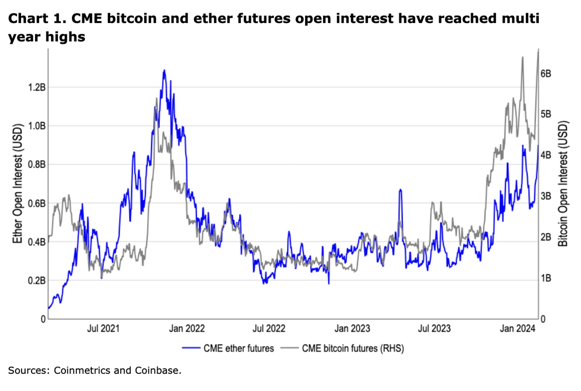 与此同时,CME 比特币和以太币期货的未平仓合约在过去六个工作日均有所回升,前者创下 63 亿美元的历史新高(见图表 1)。鉴于加密货币近期的强劲表现,以及 CME 比特币期货基差交易接近 16%(30 天年化),因此机构对此的兴趣复苏并不令人惊讶。也就是说,我们认为,鉴于未来几个月以太坊可能会发生一系列的重大催化剂,包括美国可能批准现货 ETF,如我们在最近的月度展望中所讨论的,我们认为 ETH 的未平仓合约相对于比特币将有增加的空间。