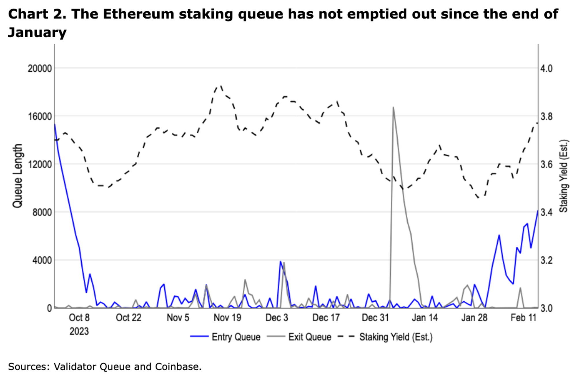 对再质押协议的兴趣可能是最近质押 ETH 增加的驱动力,这一点在自 1 月底以来一直没有清空的验证者进入队列得到了一定的体现(见图 2)。