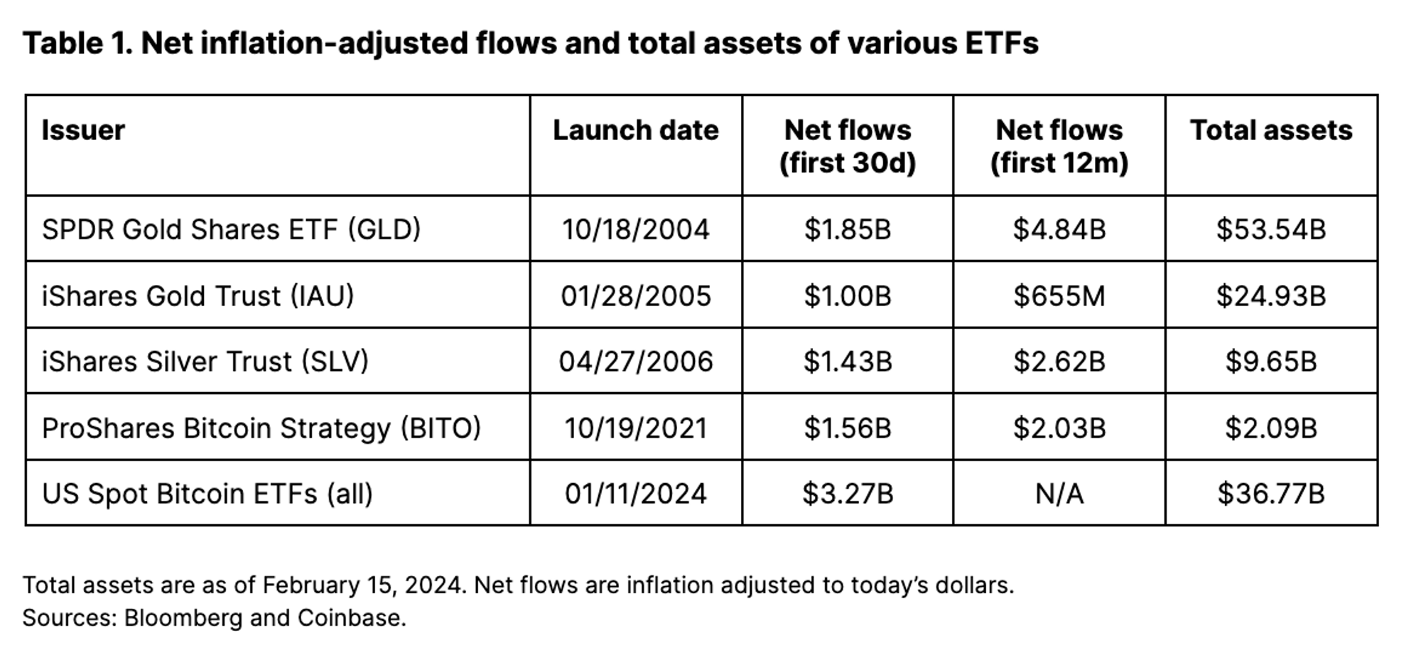 从更广泛的 ETF 市场来看,比特币 ETF 的净流入量甚至在第一个月就超过了 State Street 的 SPDR Gold Shares ETF(GLD)所吸入的净流入量,这是历史上最成功的 ETF 发行之一。GLD 在 2004 年 10 月 18 日至 11 月 18 日期间带来了 18 亿美元的通胀调整后资金 (inflation-adjusted dollars)。事实上,Bloomberg 将 BlackRock 的 iShares 比特币信托(IBIT)和 Fidelity 的 Wise Origin 比特币基金(FBTC)列为 “过去 30 年中约 5500 次新的 ETF 发行中表现最好的 0.1%。”