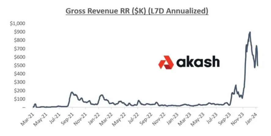 Akash Network 的核心价值在于其作为一个去中心化计算平台,利用了全球未被充分使用的 GPU 资源,连接了这些资源与需要 GPU 计算能力的用户之间。这一平台不仅为 GPU 资源的所有者提供了盈利机会,也为需要这些资源的用户提供了成本效益更高的选择。根据2023年9月的数据,Akash Network 已经在其网络上成功部署了150至200个 GPU,并实现了50%至70%的利用率。这一成绩在年总交易价值上体现为50万至100万美元,展示了去中心化计算资源共享模型的市场潜力。