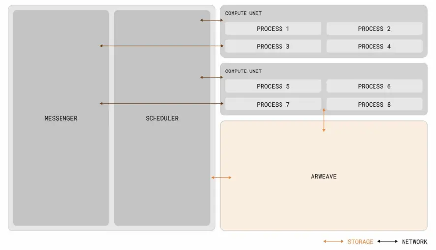 Arweave 推出的 AO 方案代表着区块链技术的一个重大创新,主要体现在其提供的超并行计算机架构上。这个架构允许在去中心化的计算环境中同时并行运行任意数量的进程,极大地提升了计算效率和扩展性。AO 的核心特点包括大规模计算能力、可验证计算的实现、以及通过构建三个不同的子网络(信使单元、调度单元、计算单元)和以 Arweave 为基础层,实现的高度并行处理能力和可扩展性。