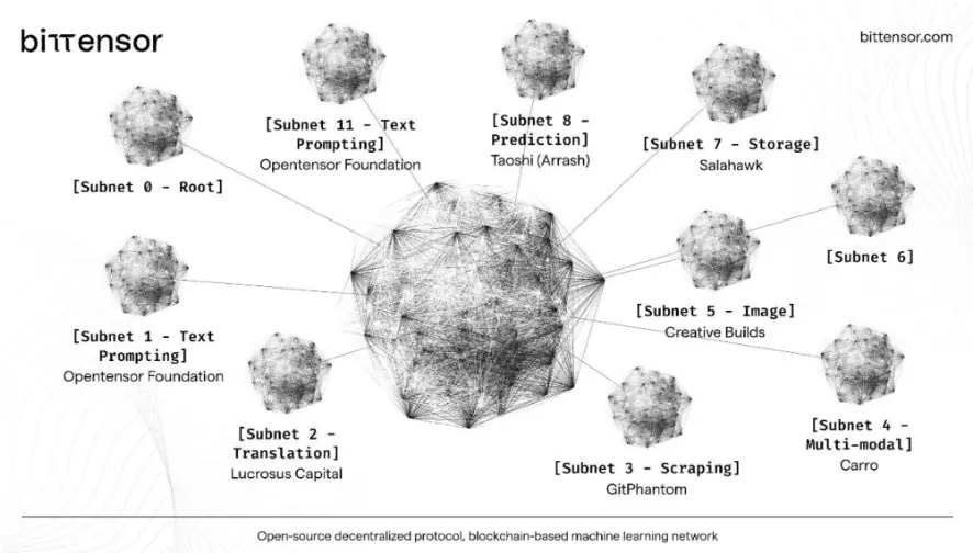 Bittensor 由 AI 研究人员 Ala Shaabana 和 Jacob Steeves 于 2019 年创立,最初构想为 Polkadot 的平行链。2023 年 3 月,该项目战略转向,决定开发自有的区块链,旨在通过加密货币激励全球机器学习节点,推动 AI 开发的去中心化。Bittensor 通过让这些节点相互协作训练和学习,引入了一种新的范式,即通过集成递增资源增强网络的集体智慧,拓展了个人研究人员和模型对整体的贡献。