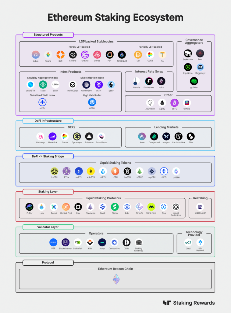 参考 @StakingRewards 对以太坊质押生态的划分,从底层向上可以分为验证者层、质押层、桥接层、DeFi基础设施层以及最上层的结构化产品层。内部的逻辑关系和各自的价值可梳理如下: