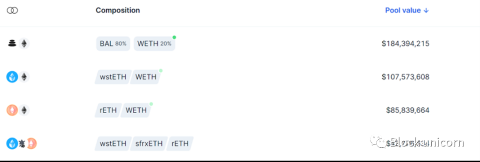 Balancer——他们在主网上的前 4 个池中有 3 个与 LSD 有关,他们的 TVL 超过 1.36 亿美元,占他们总 TVL 的 13% 以上。