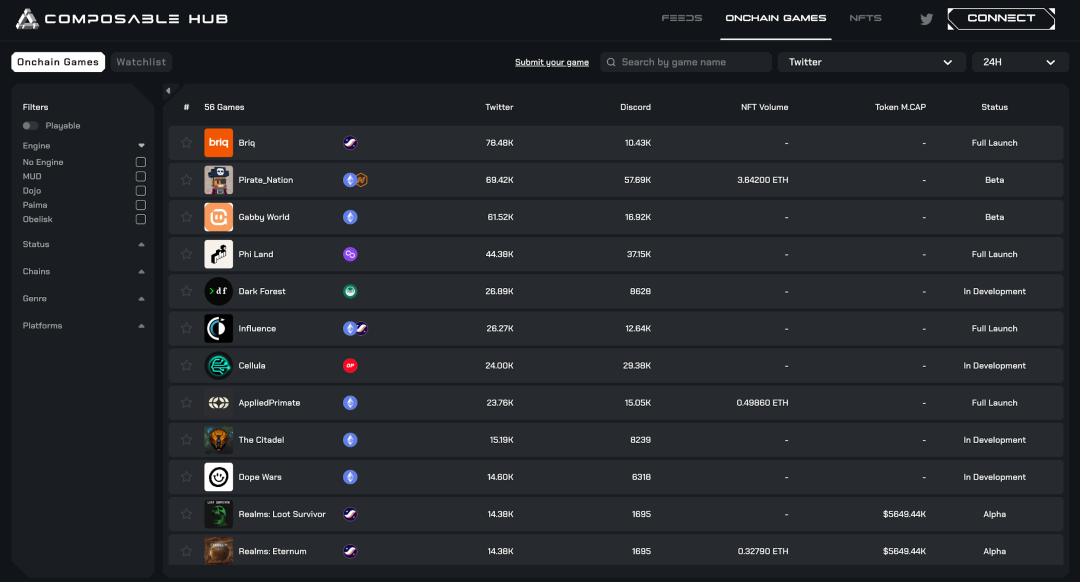 最后也介绍一下目前仍在萌芽阶段的全链游戏的聚合器/发行平台。目前由于全链游戏仍处于非常早期的阶段,市面上可玩的全链游戏数量极少,根据Composable Hub的数据显示,包括alpha、beta和完全上线的游戏中,可玩的数量不超过30个。