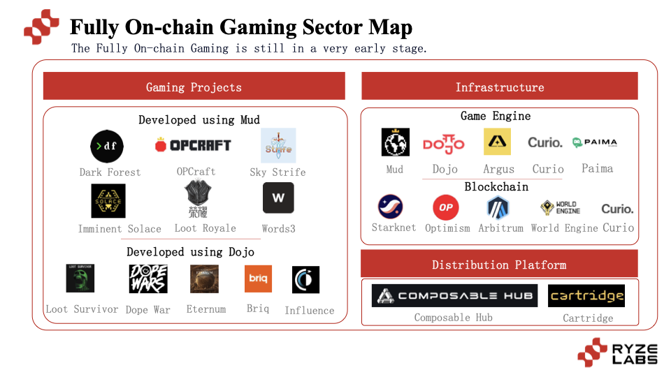 目前整个全链游戏都处于非常早期的阶段,无论是游戏项目还是相关基建都在发展中。在全链游戏领域的产业图谱中,可以大致分为:全链游戏项目、全链游戏引擎、全链游戏链、全链游戏分发平台四大类。