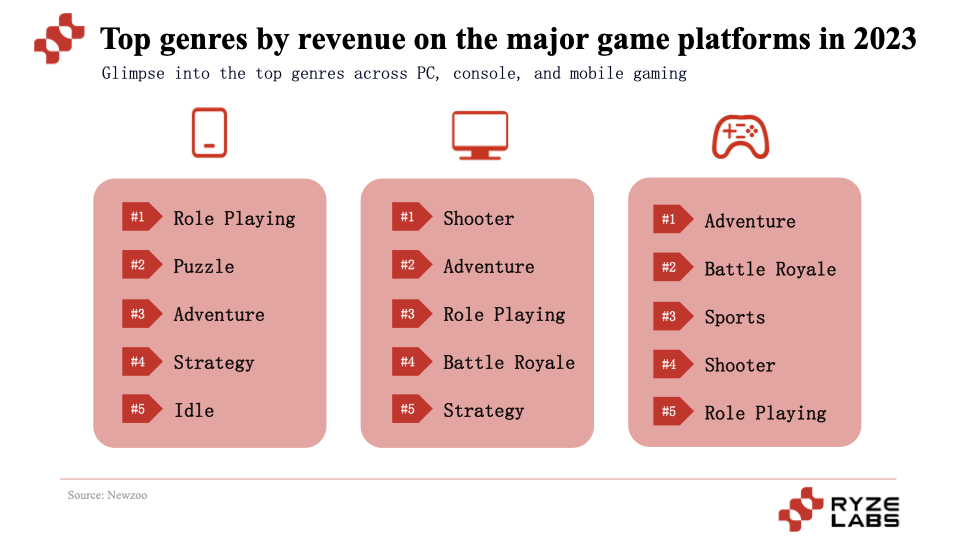 根据Newzoo的数据可以看出,角色扮演、冒险类这两类游戏在PC端、移动端和主机端都表现优异,均排名前五,此外像射击类和大逃杀类型的游戏在PC端和主机端都非常受欢迎。移动端略显不同的是,解谜类和放置类的游戏也比较受用户的喜爱。