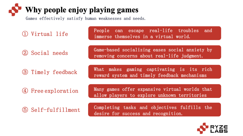 从statista的数据可以看出,目前全球的游戏玩家数量已经超过25亿,接近30亿。那么游戏是如何能够吸引全球超过三分之一的人参与呢,最核心的原因可以总结从多方面满足了人性的需求和弱点:
