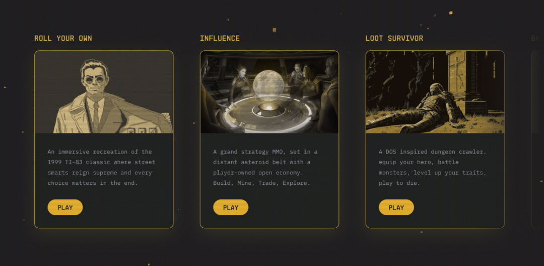 Cartridge是Starkware生态的全链游戏聚合器,致力于打造Web3 Steam,目前聚合了Starknet生态的5款游戏:Dope Wars-Roll Your Own、Influence、Loot survivor、Briq和Frens Land。