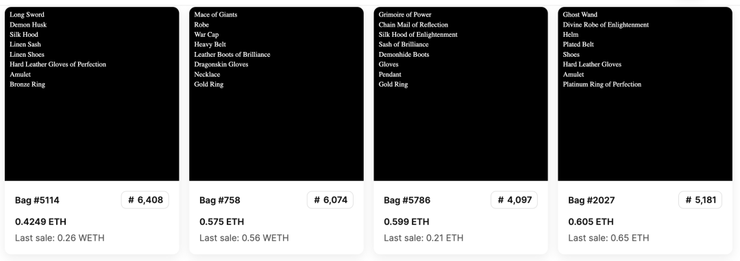Loot 于 2021 年 8 月 28 日由 @Dom Hofmann 发布,不同于常见的PFP类型的NFT,例如BAYC和Crypto Punks,Loot的每个NFT都是白字黑底的文字,对于这些文字的解释权是非常自由开放的,其完全由社区共创自治生长的特性,吸引了大量生态贡献者和相关衍生项目。