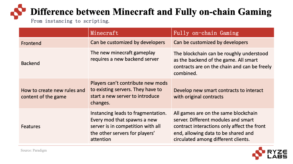 Minecraft的新玩法的创建都需要搭建新的服务器,而全链游戏的差异点在于共享同一个后端,不同的模组和智能合约交互只是影响了前端,从而使得数据在不同的客户端里面可以共享和流通。