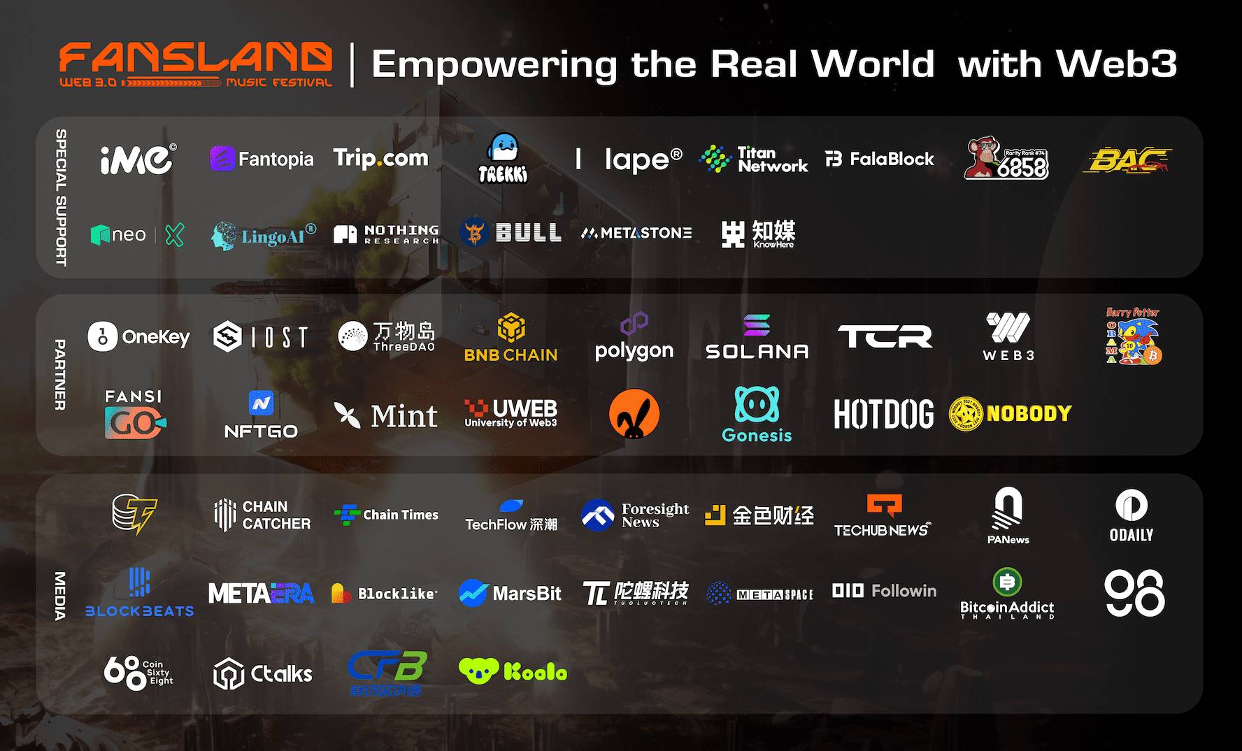 主办方特别鸣谢以下合作伙伴的大力支持:Fantopia、IME、Neo、Neuroblocks、Hape、BAC Games、LingoAI、NOTHING RESEARCH、Bull、Titan Network、Trip.com、Trekki NFT、OneKey、HPOS10I、IOST、NFTGo、Gonesis,以及NFT特别支持伙伴BNB Chain等。