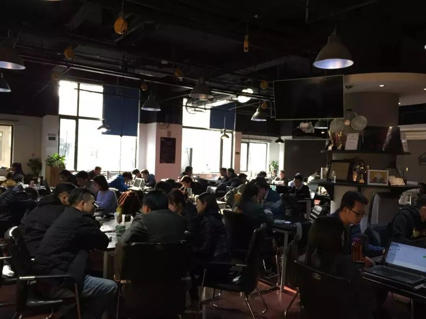 而中国的车库,在北京海淀西大街 48 号,沿着海淀图书城步行街南口向北几十米,爬上鑫鼎宾馆的二层,推开一扇吱呀作响的木门,800 平方米的大厅里密密地放着几十张宽大的桌子,每张桌子上面垂着一个插线板,连着的笔记本电脑前,坐着一群埋头工作的人——这里是车库咖啡馆。