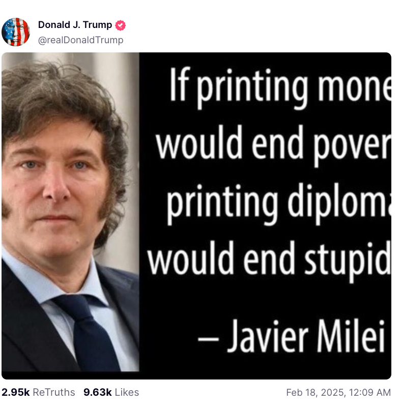 萌币网 消息,美国总统特朗普于 8 小时前在其 Truth Social 上发布阿根廷总统 Javier Milei 的照片及 Javier Milei 曾说过的话 「如果印钞能消除贫困,那么印文凭就能消除愚蠢。——Javier Milei」。