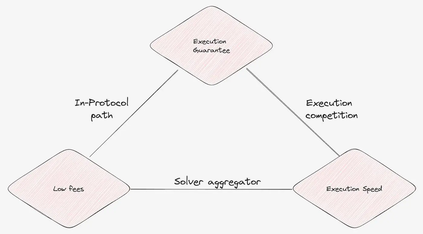 求解器层:求解器层基于用户的初始余额和意图估算费用和执行速度。在跨链设置中,这一过程被称为求解,至关重要,因为交易是异步的,子交易在执行过程中可能失败。异步性引入了跨链三难困境,涉及费用、执行速度和执行保证。