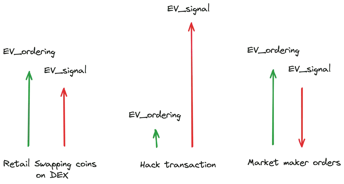 不同的用户意图在 EV_ordering 和 EV_signal 之间有不同的分布。例如,在 DEX 上换币的意图通常具有较高的 EV_ordering 值,但 EV_signal 值较低。相反,黑客交易的 EV_signal 分量会更高,因为前置运行会比执行交易获得更多价值。值得注意的是,EV_signal 有时可能是负值,例如在做市商交易的情况下,由于做市商对未来市场状况有更好的了解,执行这些订单的实体可能会遭受损失。