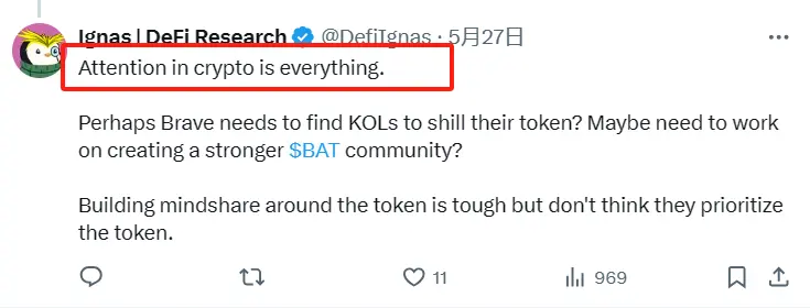 有人提出 $BAT 惨淡的币价表现可能是因为团队将资金重点放在项目研发上,对项目营销有所欠缺,同时从官方的推文中也看不到太什么提及代币的推文。 Ignas 也在评论区直言在加密世界注意力就是一切,团队或许应该请一些KOL来推广 $BAT 同时建立更强大的社区来增强 $BAT 的市场认知度。
