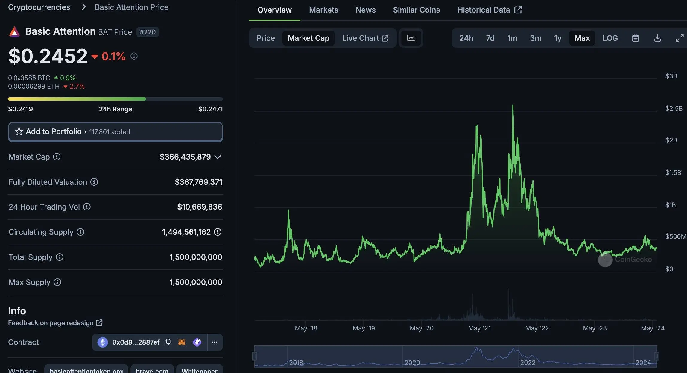 Ignas 直言曾对 $BAT 的愿景非常看好,并言这曾是他仓位最大的山寨币,虽然他在高点附近全部卖出,但 $BAT 的价格走势仍带来一些启示:产品上的成功并不一定能转化为长期的代币优秀价格表现。