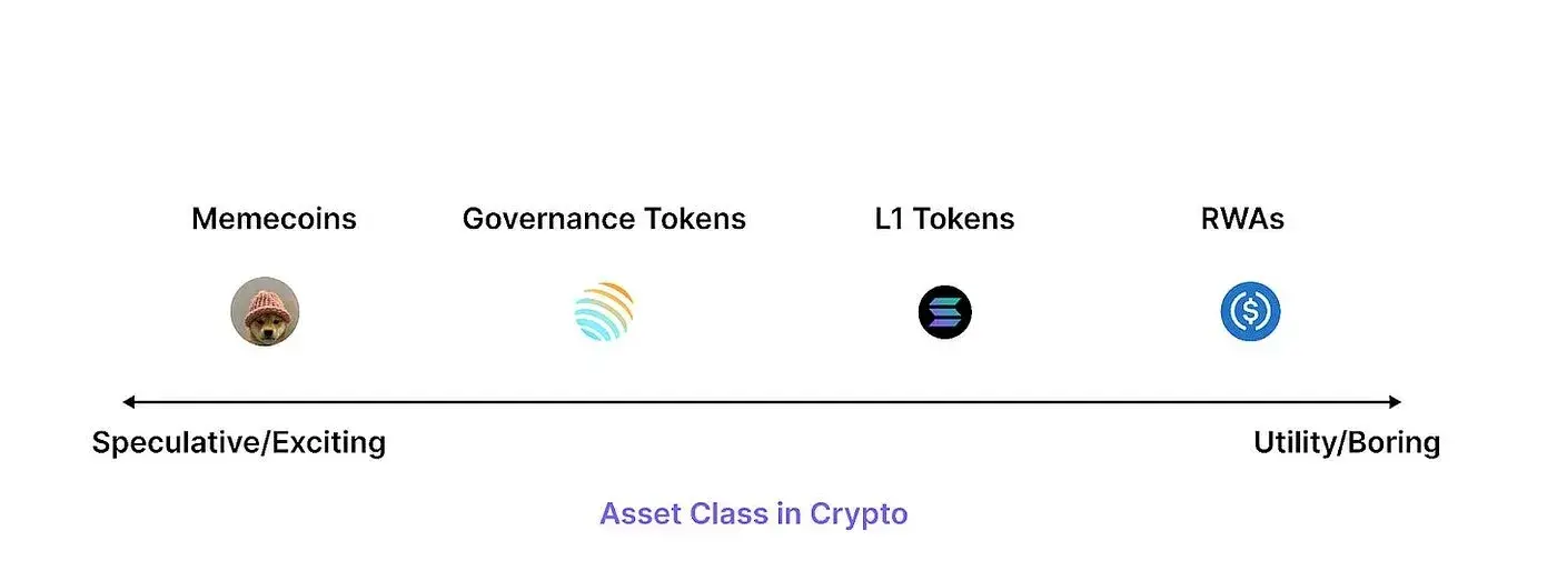 这张图展示了加密资产两端的不同性质:一端是以 MEMECOIN 为代表的娱乐至死、疯狂投机,一端是以 RWA 资产为代表的乏味实用性资产。