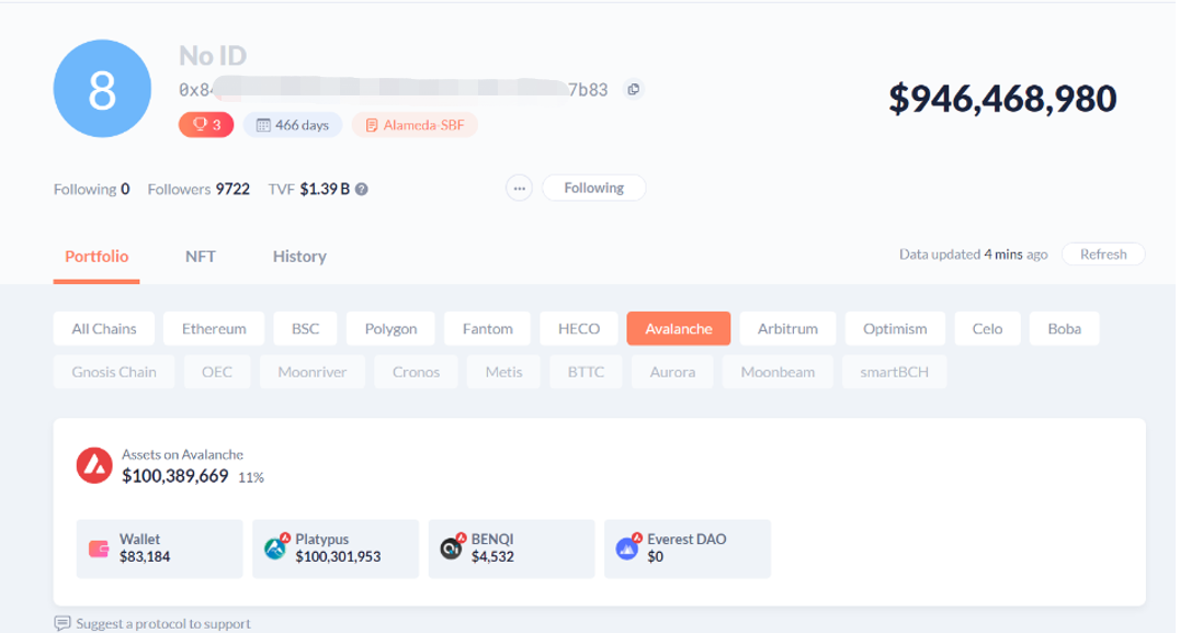 钱包二:总资产 9.46 亿美金,avax 网络资产 1 亿美金,占比约 11%