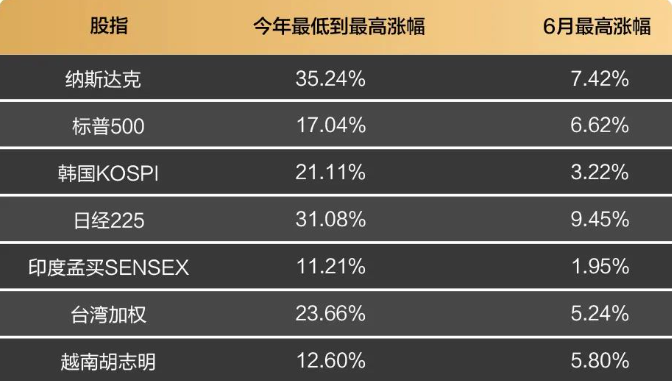 今年以来,美股在AI浪潮的加持下,科技股引领美股走出牛市步伐,英伟达市值突破一万亿美元,Adobe公司本月最高涨幅超25%。进入6月份以来,美股纳指最高涨幅为7.43%,标普最高涨幅6.63%。亚太市场表现也非常亮眼,其中日经225指数是亚太地区表现最亮眼的指数,自3月中旬以来连续上涨,创下33年来最高,6月份最高涨幅更是达9.45%。