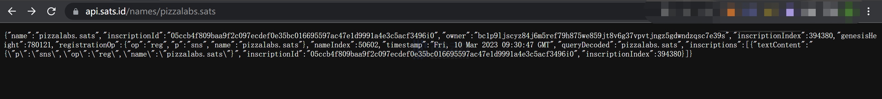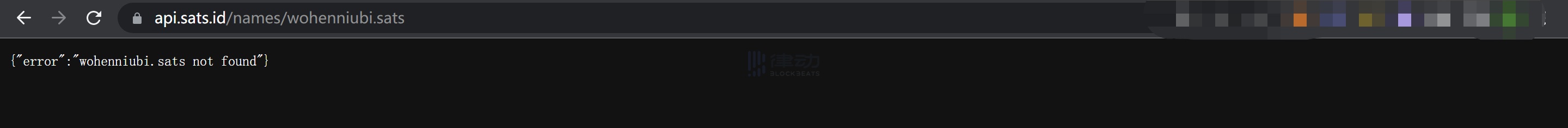 想要 Mint 属于自己的 .sats 域名前,需要通过 Sats Names 官方的索引 API 对目标域名是否已被 Mint 进行查询。查询方法是直接访问 https://api.sats.id/names/xxx.sats(将 xxx.sats 更改为您将要 Mint 的目标域名)。