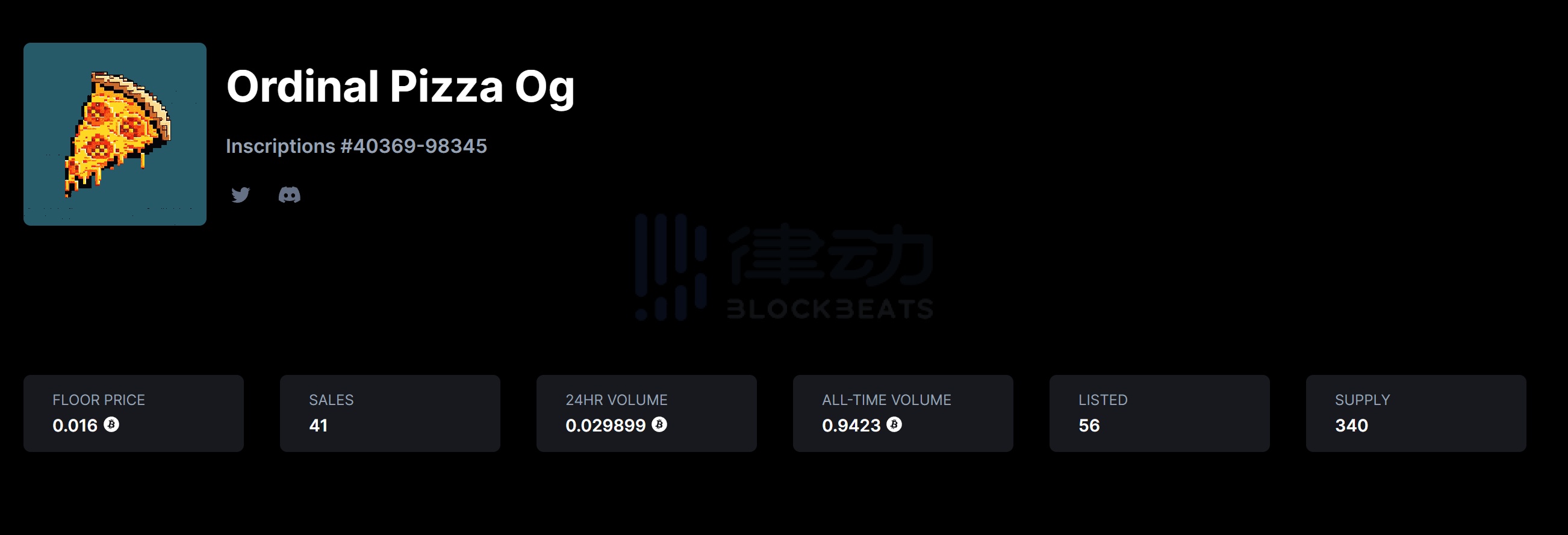 此外,比特币原生 Meme 文化的另一个重要元素就是「披萨」,目前已经有关于「披萨」的项目 Ordinal Pizza OG 出现。