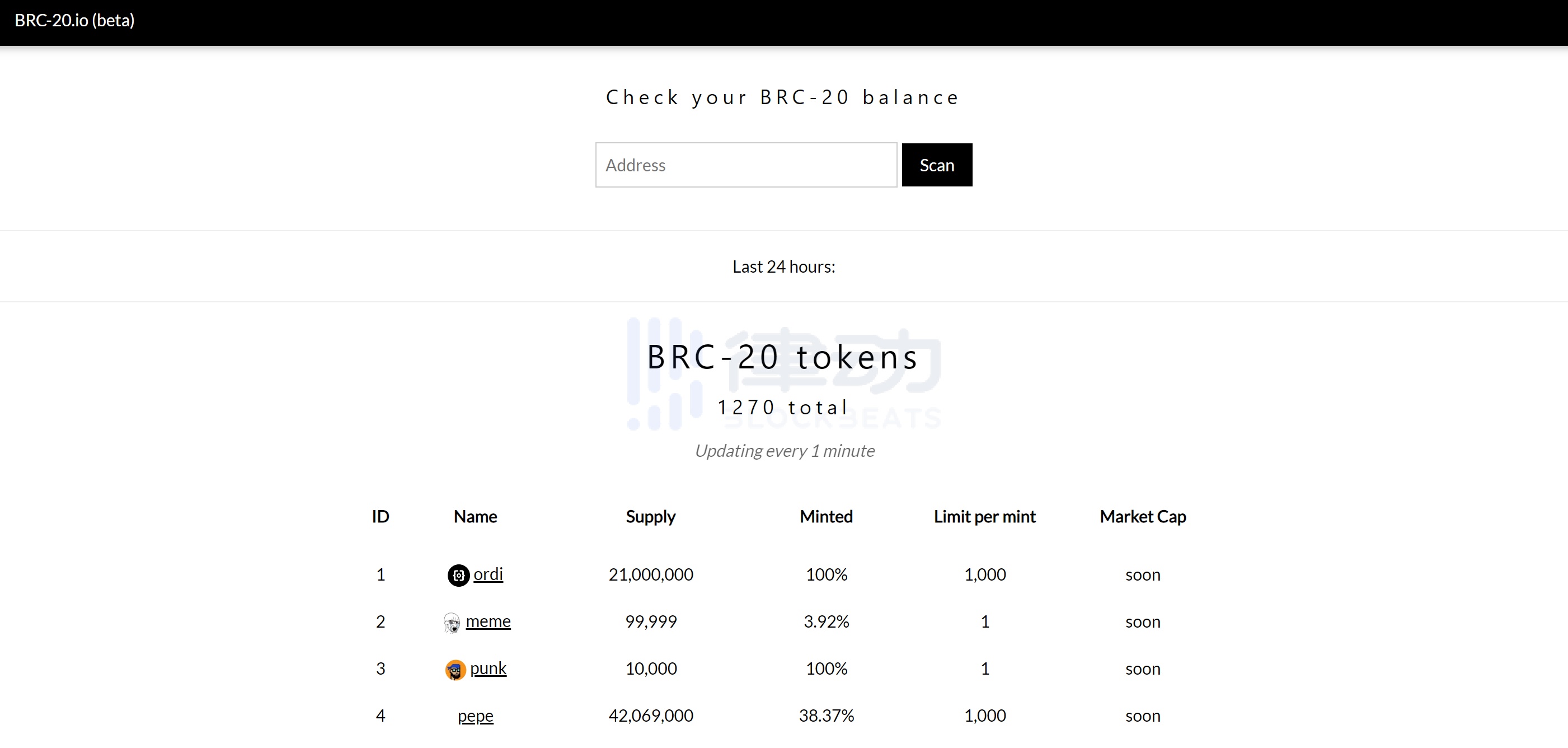 BRC-20 Token 交易相关的基建在近期没有特别大的进展,但是已经有了一些统计索引的网站出现,比如「brc-20.io」。通过该网站,我们可以快速检索目标地址下有多少 BRC-20 Token 余额,也可以查看所有已经被成功部署的 BRC-20 Token 的种类及其可供 Mint 的余量。
